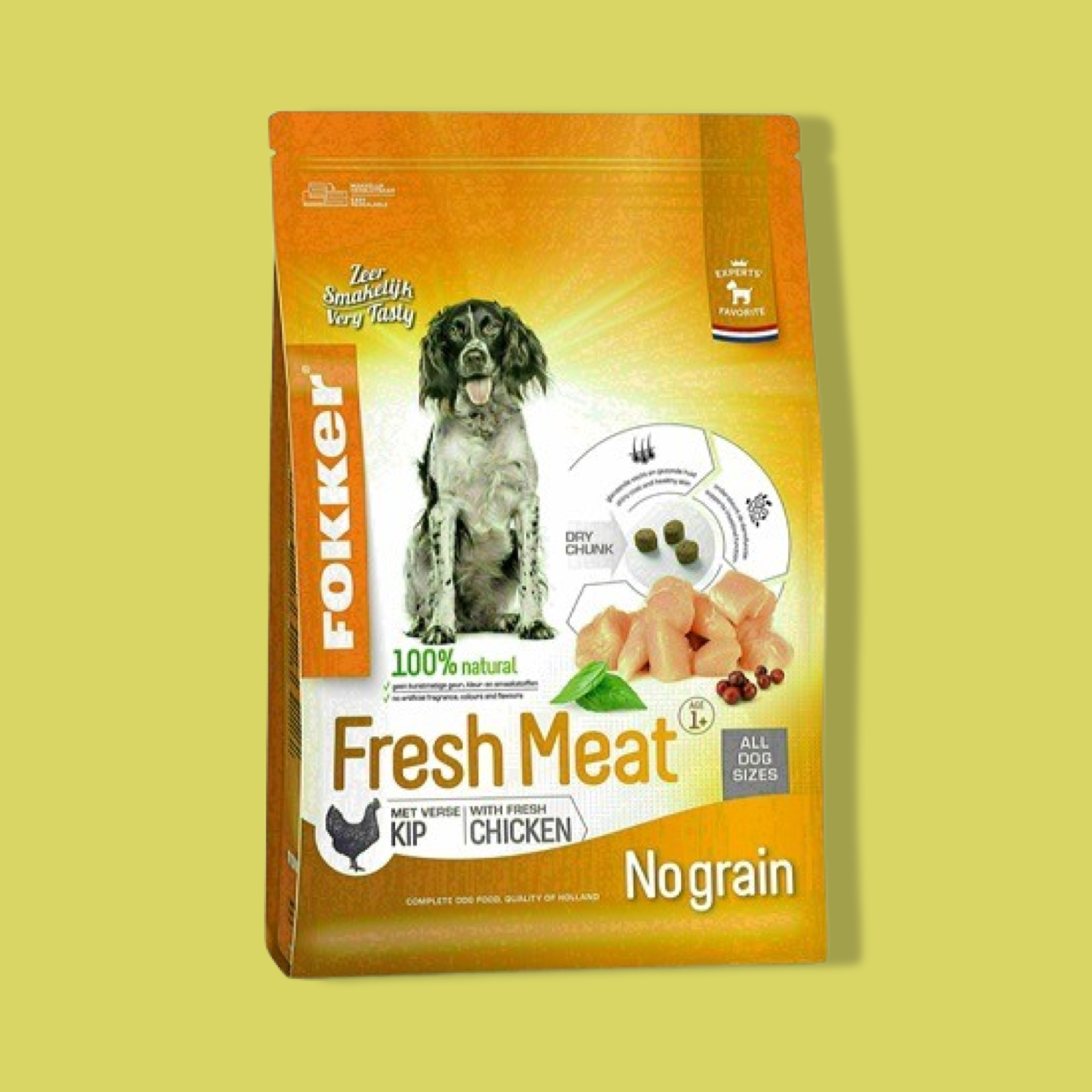 Fokker +Fresh Meat is een high premium hondenvoeding voor volwassen honden met 35% kip, waarvan maar liefst 20% verse kip. Fokker +Fresh Meat is volledig vrij van granen (0%) en daardoor tevens gluten(allergie)vrij. Fokker +Fresh Meat bevat (zoete) aardappels, groenten en vruchten en is daardoor gezond en beschermend. Hoogwaardige Noorse zalmolie, net als lijnzaad een bron van omega 3-6 vetzuren, geeft optimale ondersteuning voor een volle en glanzende vacht. De toevoeging van chondroïtine en glucosamine ondersteunt de bescherming van het kraakbeen. Dit kwaliteitsproduct heeft een zeer hoge verteerbaarheid. De hierdoor beperkte hoeveelheid ontlasting is door het gebruik van Yucca nagenoeg reukloos. Fokker +Fresh Meat is het beste dat jij jouw hond kunt bieden.