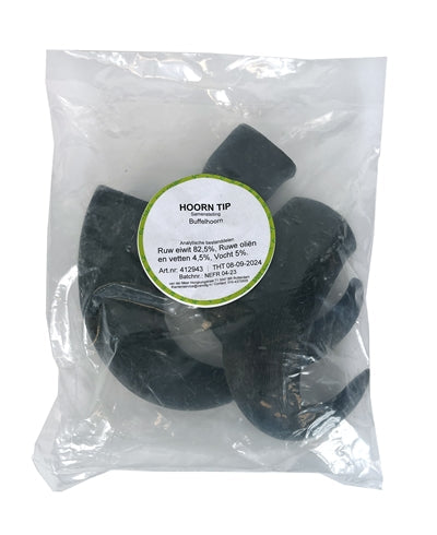 Voor de stevige kauwers zijn er deze Hoorn Tips; een 100% natuurlijk stuk buffelhoorn, in dit geval het puntige uiteinde. De hoorn gaat zeer lang mee en helpt door het kauwen bij het schoonhouden van tanden en tandvlees. Daarnaast is de buffelhoorn rijk aan mineralen en stinkt het niet. Een heerlijke snack voor de hond, waar hij uren zoet mee zal zijn.