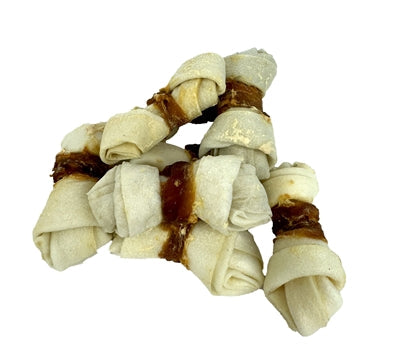 Petstyle Living Geknoopt Bot Wit Met Eend 6,5-7,5 cm 25 st Het Petstyle Living Geknoopt Bot Wit Met Eend 6,5-7,5 cm 25 st is aanvullend voeder voor de hond, een smakelijke hondensnack van runderhuid omwikkeld met eend. Heerlijk om lekker op te kauwen en verveling tegen te gaan! Deze traktatie is gemaakt van runderhuid omwikkeld met gedroogd eendenvlees, waardoor het bot extra lekker wordt. Kauwen op runderhuid gaat verveling tegen en helpt bij het schoonhouden van het gebit, omdat de runderhuid bij het kauwen langs de tanden wrijft en zo tandplak helpt verminderen.