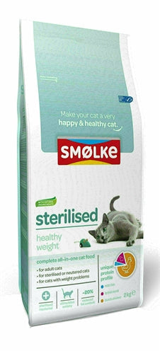 Smølke Sterilised bevat 40% minder vet dan de reguliere Smølke kattenbrokjes voor volwassen katten, maar voorziet wel in alle voedingsbehoeften. De extra vezels in de voeding zorgen voor een verzadigd gevoel en door de toevoeging van L-Carnitine en Choline wordt bovendien de vetverbranding extra gestimuleerd.