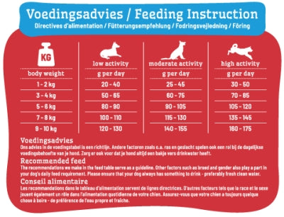 Ruw eiwit 26%, ruwe celstof 5%, vetgehalte 13%, ruwe as 6,5%, calcium 1,4%, fosfor 1%, omega-3 vetzuren 0,8%, omega-6 vetzuren 2,2%
